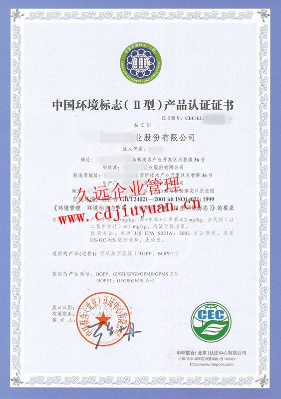 中國環(huán)境標志產品II型認證證書(十環(huán)II型)